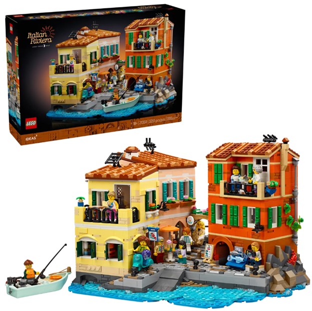 Lift off the roofs and upper stories of the three buildings to view the highly detailed interiors. There is a gelato store, a diving equipment store and a fish market, and above them, the homes of the storekeepers. Add the 10 LEGO minifigures to create authentic scenes: a fisher in their boat on the Mediterranean Sea, a nonna showing her grandson how to make trofie pasta and focaccia, a visiting food critic trying the local cuisine, a scooter driver cruising down the street… and look out for the little kitten eating a stolen fish in the alleyway! This LEGO Ideas collectible building set contains 3,251-pieces.